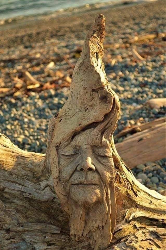 流木に人の顔をリアルに掘った。