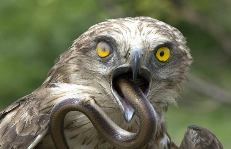 ヘビを飲み込む猛禽類の図。