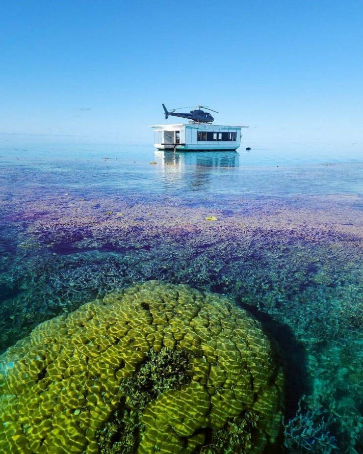 サンゴ礁の海に留まるヘリコプター