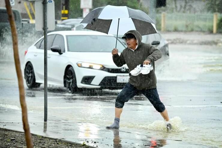 水たまりを靴を脱いで渡る人。