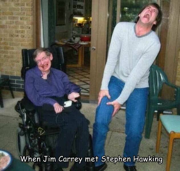 ホーキング博士の車イスに轢かれるジム・キャリー