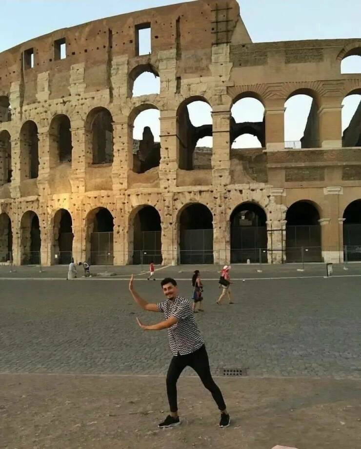 本来、ピサの斜塔でするべきポーズをコロッセオで。